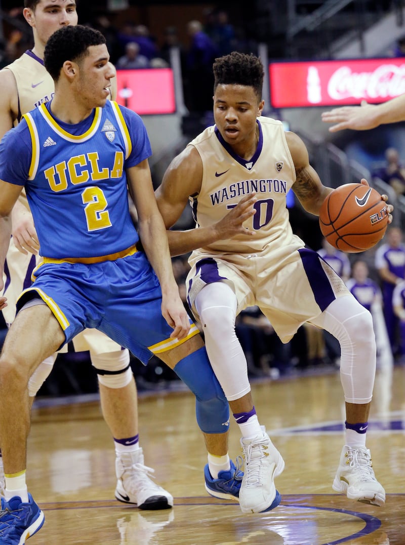 Washington’s Markelle Fultz (20) is defended by UCLA’s Lonzo Ball during game Saturday, Feb. 4, 2017, in Seattle. | AP