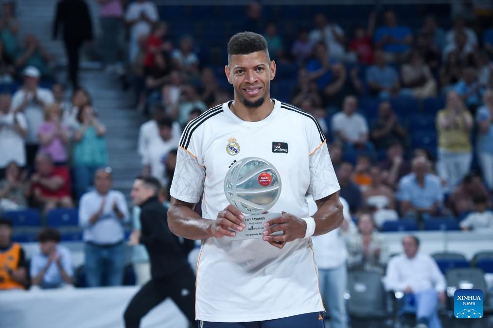 Real Madrid’s Edy Tavares receives the Best Defender of the Season prize during the Liga ACB basketball match between Real Madrid and Granada in Madrid, Spain, May 25, 2025. (Photo by Gustavo Valiente/Xinhua)