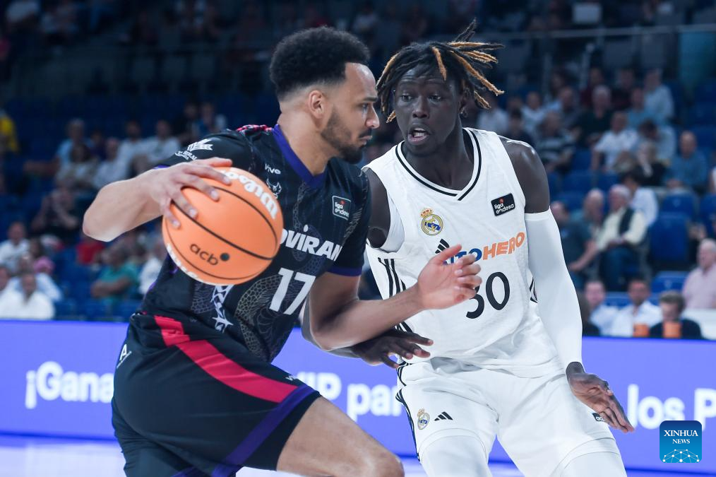 Real Madrid’s Eli John Ndiaye (R) vies with Coviran Granada’s Amine Noua during the Liga ACB basketball match between Real Madrid and Granada in Madrid, Spain, May 25, 2025. (Photo by Gustavo Valiente/Xinhua)