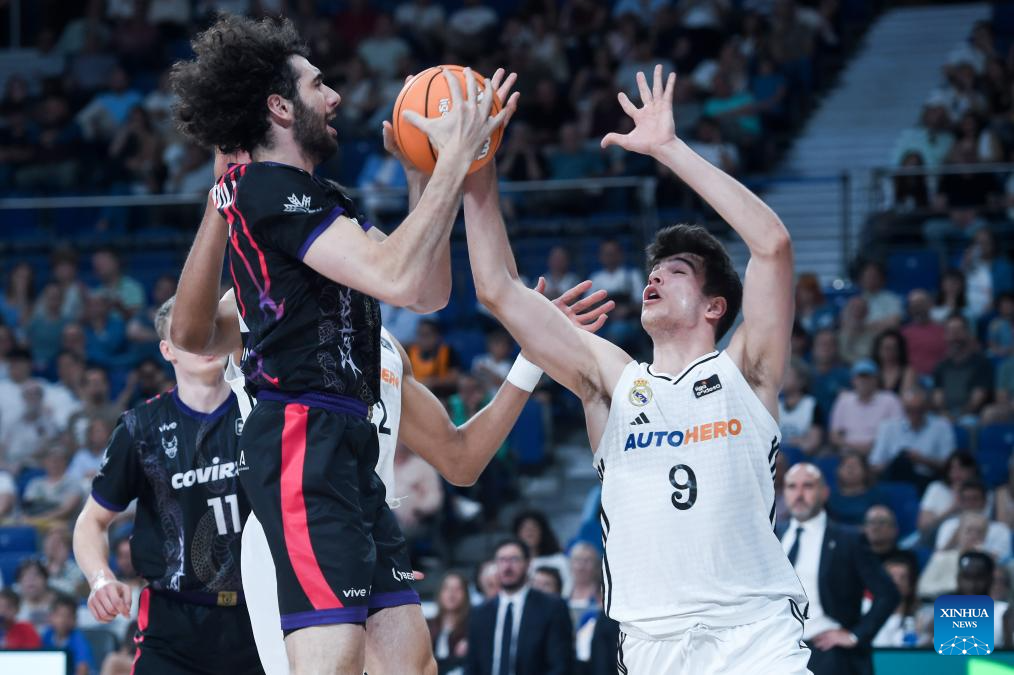 Real Madrid’s Hugo Gonzalez (R) vies with Coviran Granada’s Giorgi Bezhanishvili during the Liga ACB basketball match between Real Madrid and Granada in Madrid, Spain, May 25, 2025. (Photo by Gustavo Valiente/Xinhua)