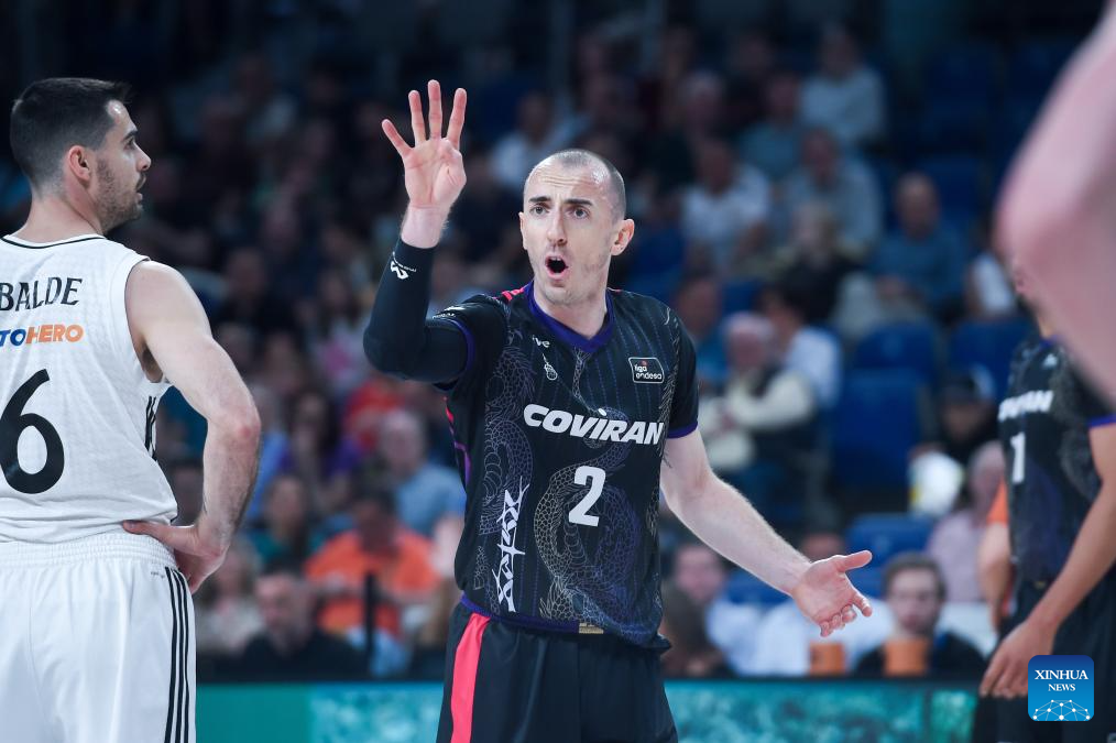 Coviran Granada’s Jonathan Rousselle (C) reacts during the Liga ACB basketball match between Real Madrid and Granada in Madrid, Spain, May 25, 2025. (Photo by Gustavo Valiente/Xinhua)