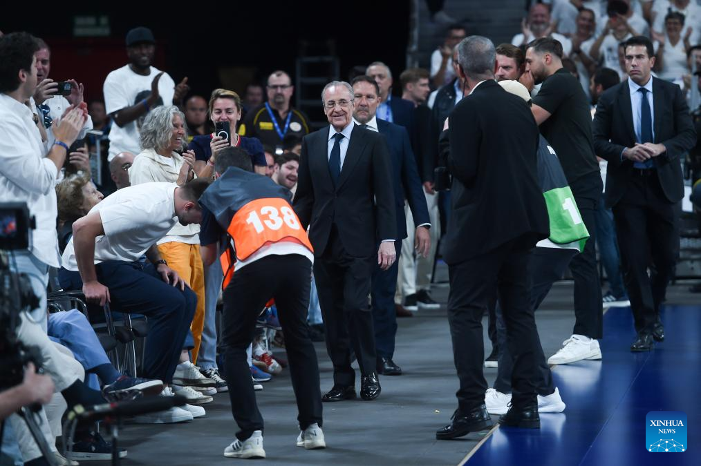 Florentino Perez (C), President of Real Madrid club, arrives to watch the game during the Liga ACB basketball match between Real Madrid and Granada in Madrid, Spain, May 25, 2025. (Photo by Gustavo Valiente/Xinhua)