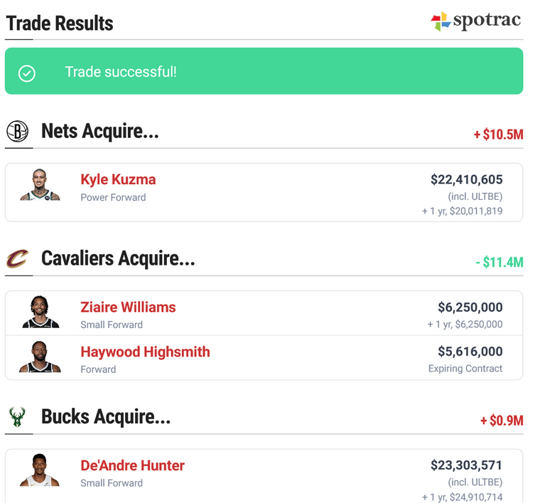 The Cavs only make this deal if they’re saving a substantial amount of money without breaking up the core. To make it happen, I’m wrangling the Nets to make it a three-team deal. In this shuffling of wings, Milwaukee acquires Hunter, Kyle Kuzma heads to Brooklyn, and Cleveland gets Ziaire Williams and the expiring deal of Haywood Highsmith. Since the Bucks are getting the Cavaliers out of a bit of a salary jam, they don’t need to send any picks or players to them.