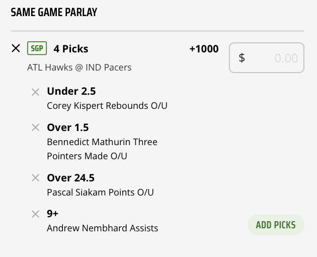 If you’re building an SGP (Same Game Parlay) to tip off your Saturday evening in this matchup, the four picks in this post combine to an even +1000 overall when we add in the over on Mathurin’s 3PM (three-pointers made).