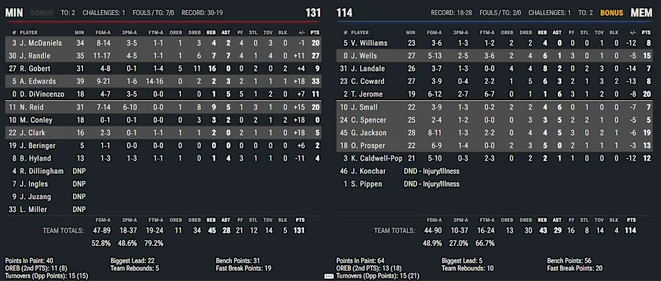 The Grizzlies final push came early in the fourth quarter, drawing eight free throw attempts early to slice the lead down to 13, but that was as close as it ever got. It was nearly seven full minutes of Yakety Sax basketball with both teams throwing the ball all over the place, but Minnesota just had too many shot makers on their team.