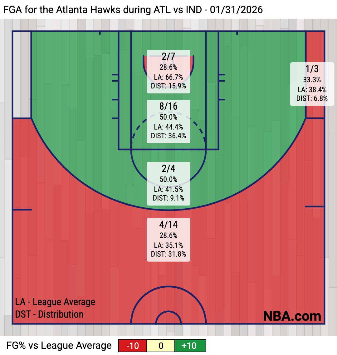 The second half saw the Hawks score only 20 points in the paint, seeing a far lower volume and shooting percentage in the paint and at the rim: