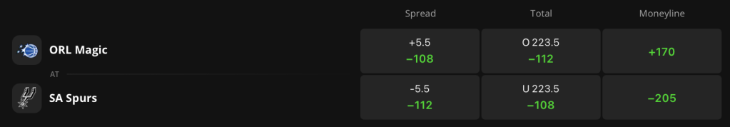 Looking at the odds for tonight, the Spurs are 5.5-point favorites with -205 moneyline odds on DraftKings Sportsbook. The Magic hold +170 odds of winning outright, with the game total set at 223.5 points.