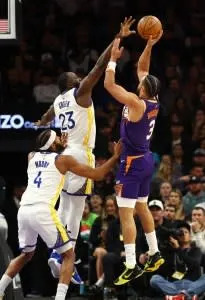 Dec 18, 2025; Phoenix, Arizona, USA; Golden State Warriors forward Draymond Green (23) defends against Phoenix Suns forward Dillon Brooks (3) in the first half at Mortgage Matchup Center. Mandatory Credit: Mark J. Rebilas-Imagn Images