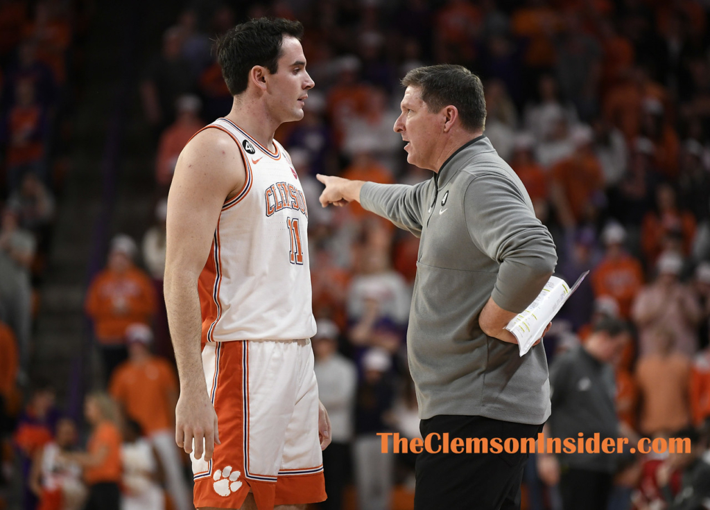 Clemson head coach Brad Brownell coaches forward/center Nick Davidson (11) as the Tigers played NC State on Tuesday, January 20, 2026, at Littlejohn Coliseum in Clemson. (Bart Boatwright/The Clemson Insider)