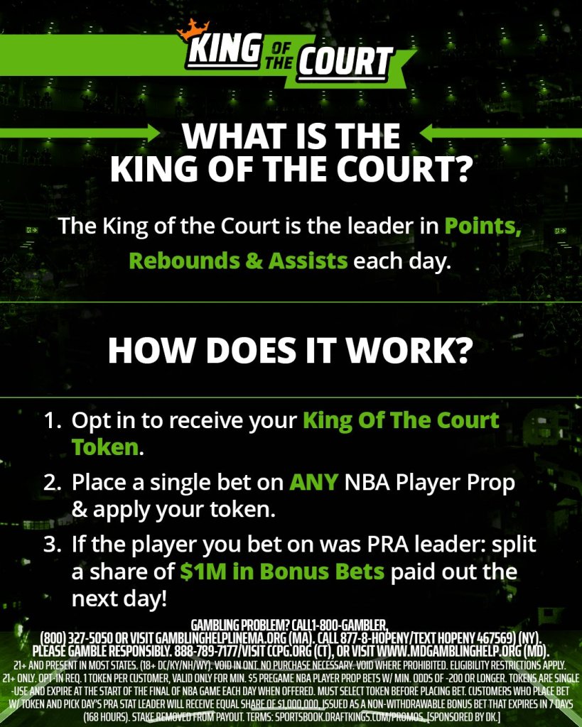 With another NBA slate on deck, it’s almost time to see who claims the crown. You asked for it, we answered. DraftKings Sportsbook is running back the King of the Court promotion every week!