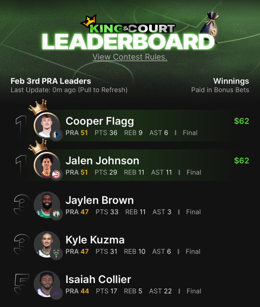 We do need to watch out for any stat corrections with a leaderboard this close. But for now, Flagg and Johnson bettors will be going home with a $62 bonus bet. All that’s left are two more games.