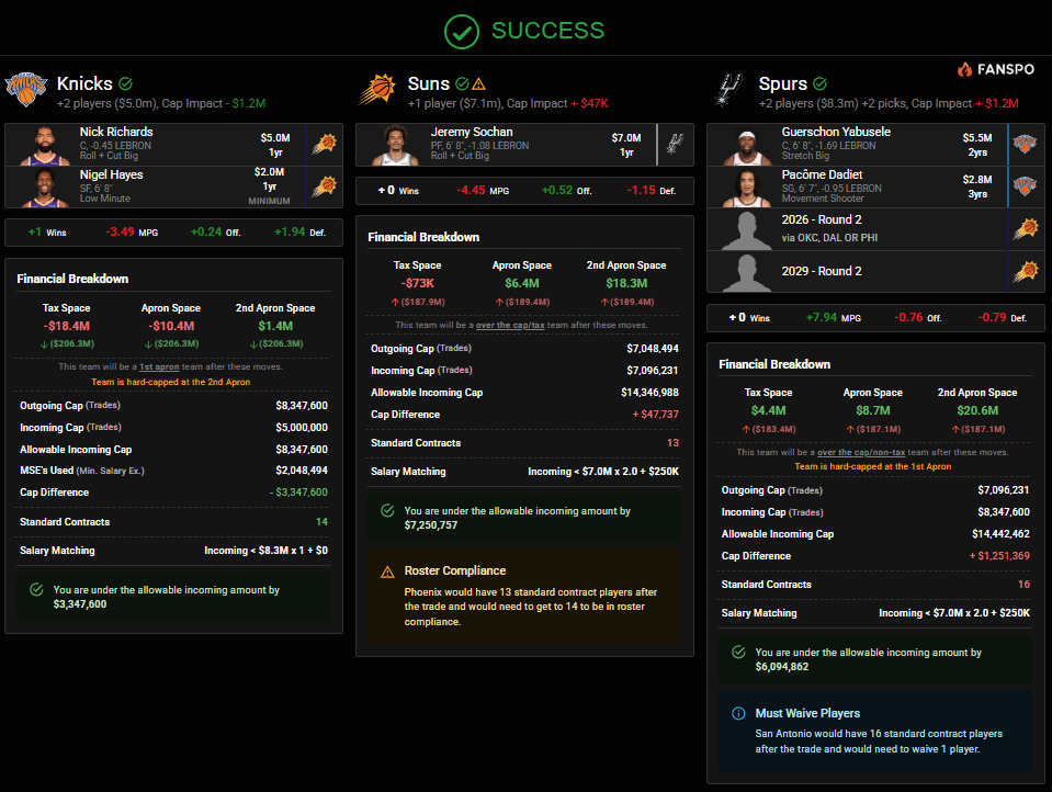 As you can see above, this gives the Suns a path to move off both Nick Richards and Nigel Hayes Davis, with those contracts heading to New York. From the Knicks’ side, there is flexibility gained. They clear two deals that sit on their books for the next two and three seasons in Gershon Yabusele and Pacome Dadiet. Those contracts slide to San Antonio in a three team construction, and the Spurs send Jeremy Sochan to Phoenix.