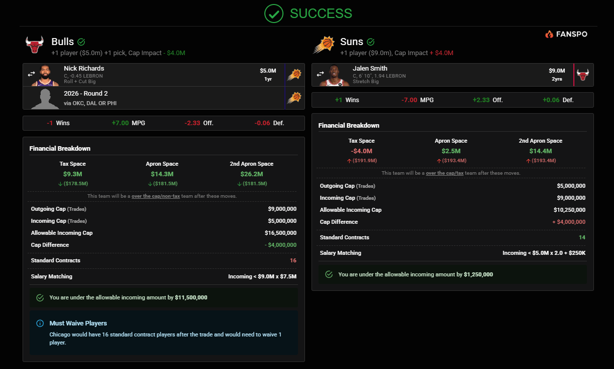 Would you take Jalen Smith for this package? The Suns get a power forward to slot in for the time being, and the Bulls get a big man they can run out there for the rest of the season and a 2nd round pick for their trouble.