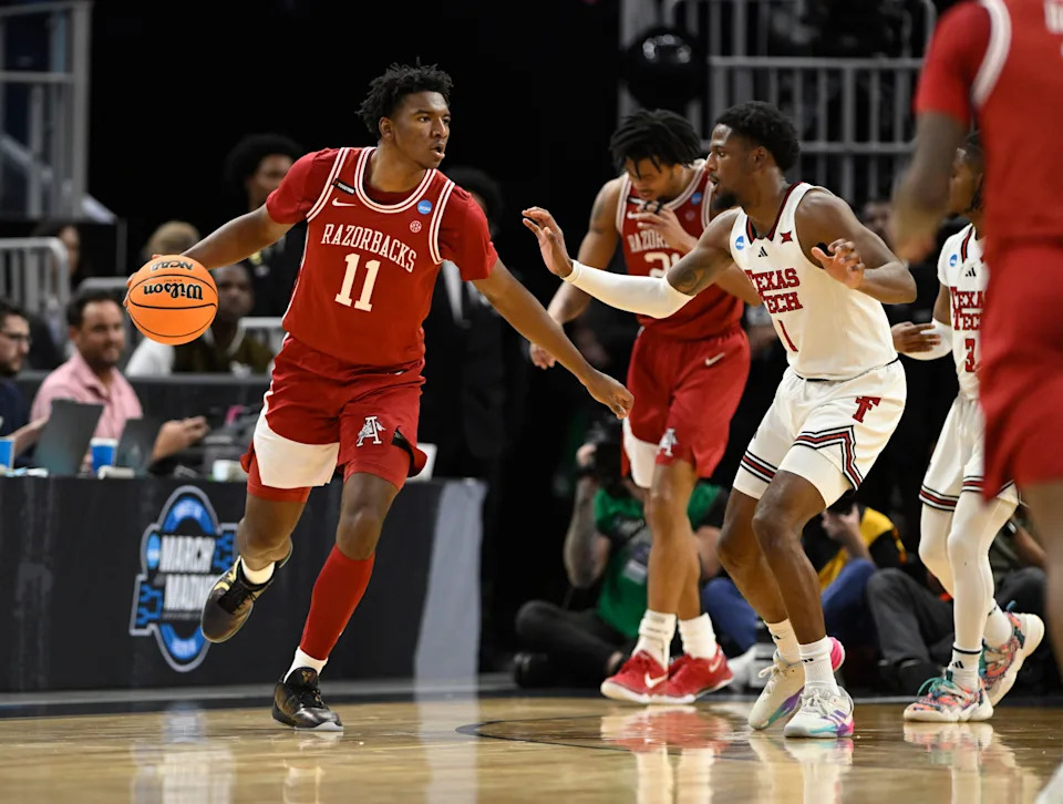 Mar 27, 2025; San Francisco, CA, USA; Arkansas Razorbacks forward Karter Knox (11) dribbles downcourt during the second half against the Texas Tech Red Raiders during a West Regional semifinal of the 2025 NCAA tournament at Chase Center. Mandatory Credit: Eakin Howard-Imagn Images
