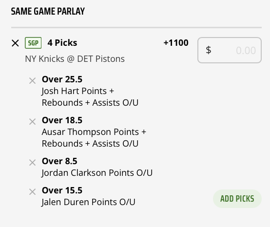 Let’s take a look at the top player prop bets from both the Knicks and Pistons in this Friday night matchup. These picks can be used as standalone plays or combined in a Same Game Parlay (SGP), as indicated at the bottom of the post.
