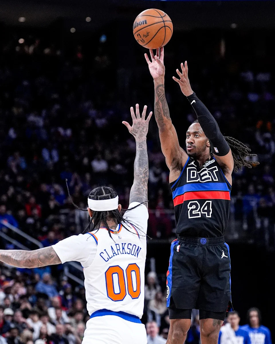 Detroit Pistons guard Daniss Jenkins (24) shoots a 3-pointer against New York Knicks guard Jordan Clarkson (00) during the first half at Little Caesars Arena in Detroit on Friday, February 6, 2026.