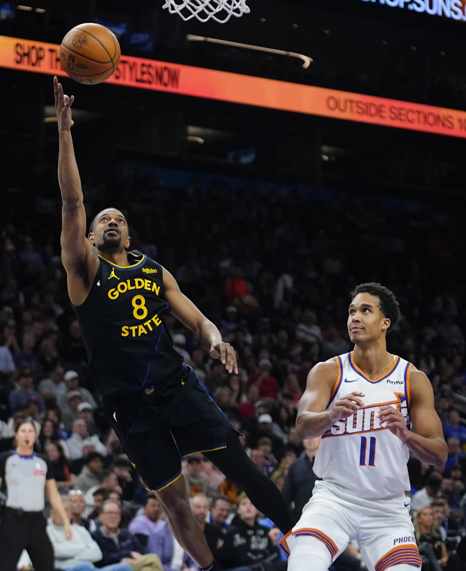 Warriors De’Anthony Melton (8) makes a layup past Suns center Oso Igohodaro (11) during a game at Mortgage Matchup Center in Phoenix on Feb. 5, 2026.