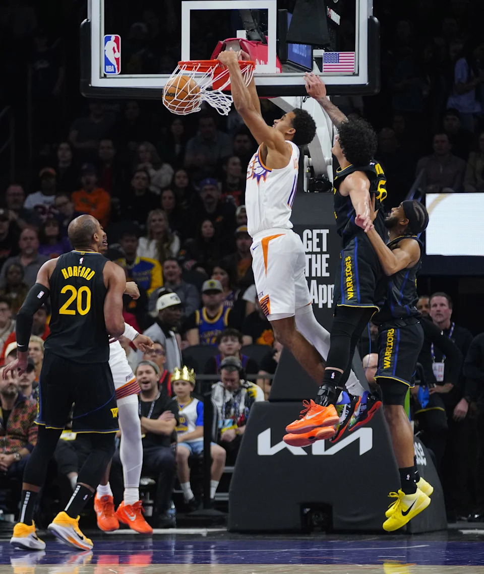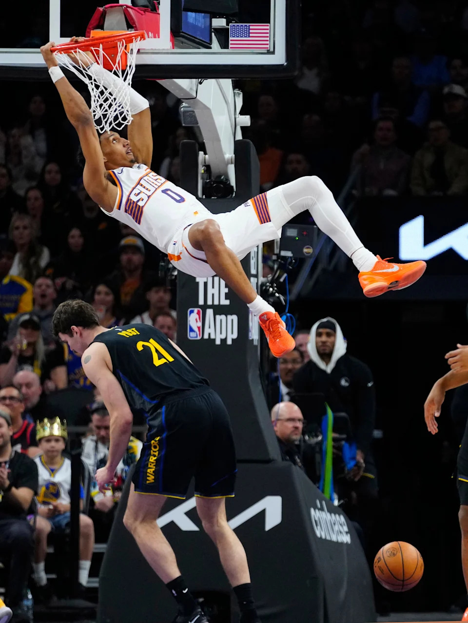 Suns forward Ryan Dunn (0) dunks the ball against Warriors center Quinten Post (21) during a game at Mortgage Matchup Center in Phoenix, on Feb. 5, 2026.