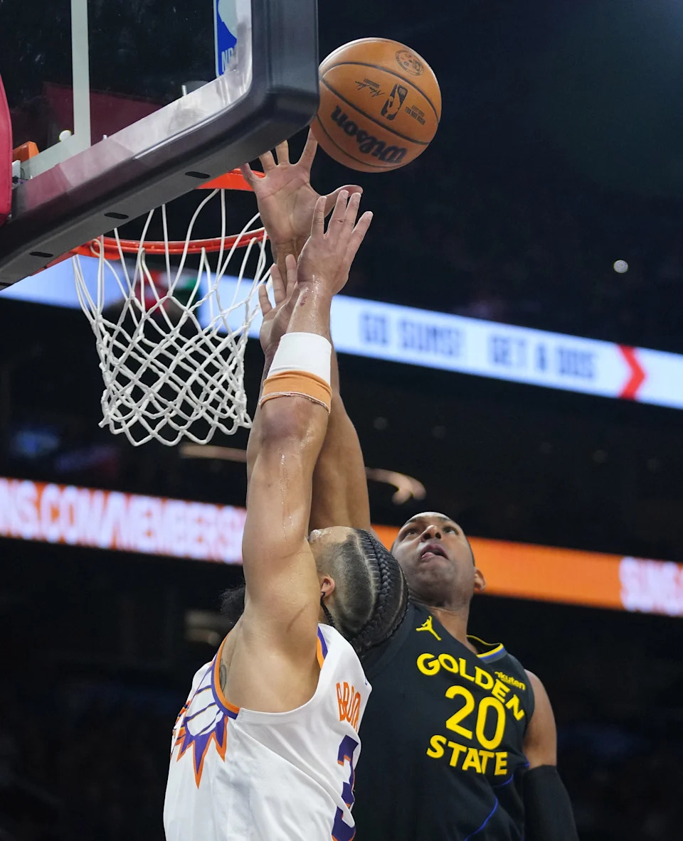Warriors center Al Horford (20) blocks a shot from Suns guard Dillon Brooks (3) during a game at Mortgage Matchup Center in Phoenix on Feb. 5, 2026.