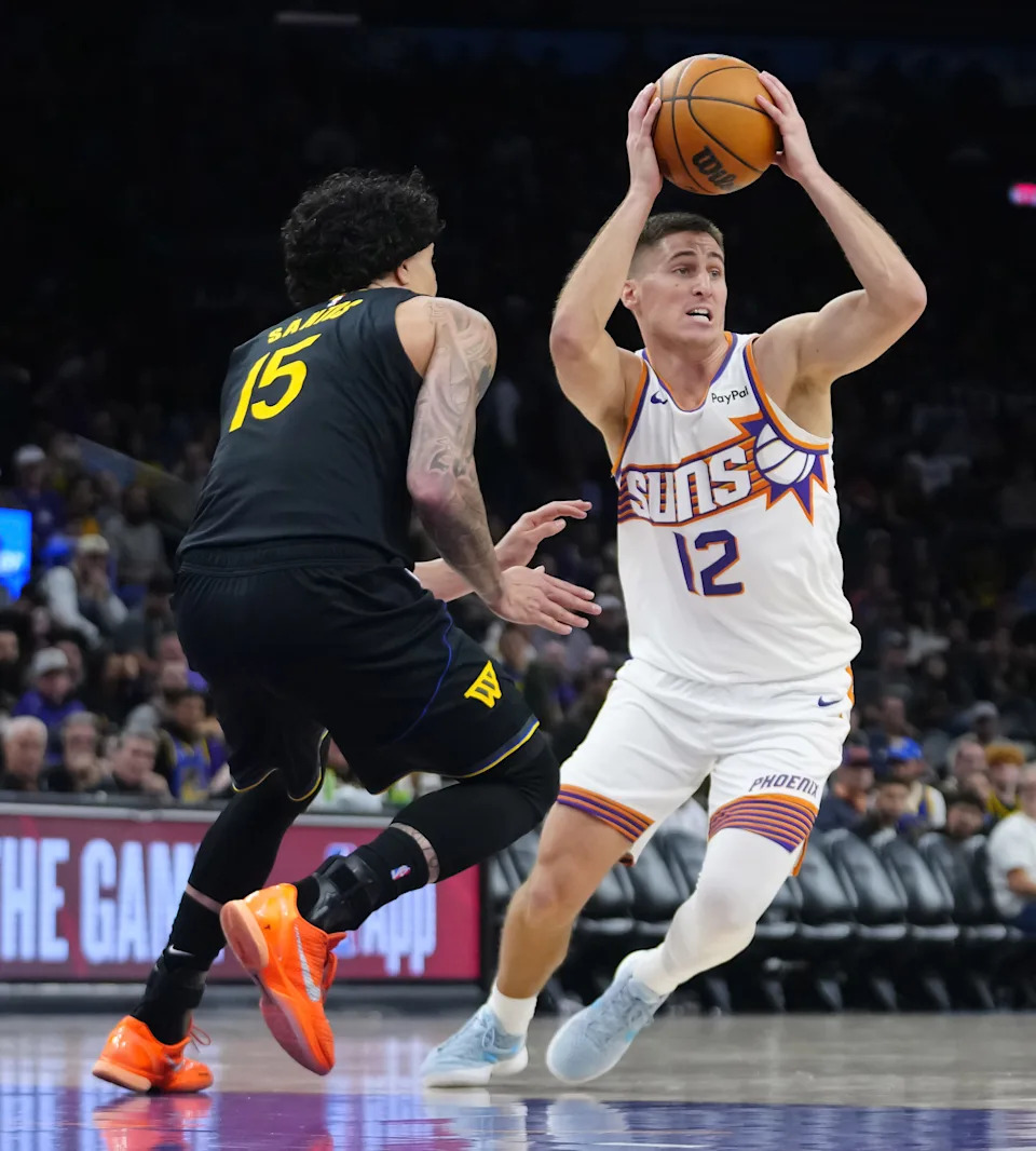 Suns guard Collin Gillespie (12) dribbles up the court against Warriors forward Gui Santos (15) during a game at Mortgage Matchup Center in Phoenix on Feb. 5, 2026.
