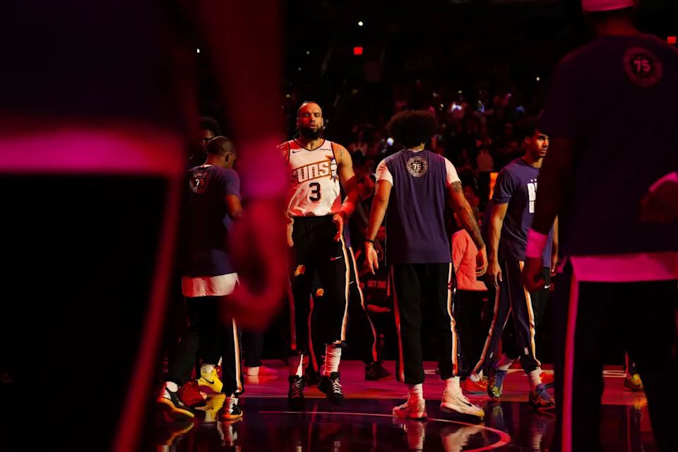 The Phoenix Suns’ starters line up before a game against the Golden State Warriors at Mortgage Matchup Center in Phoenix on Feb. 5, 2026.