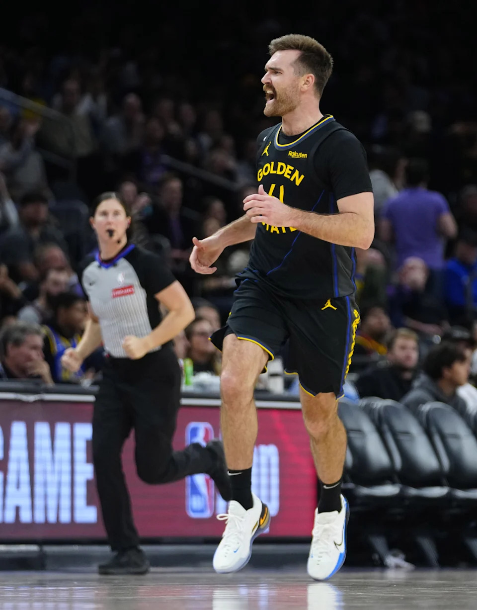 Warriors guard Pat Spencer (61) celebrates a three pointer against the Suns during a game at Mortgage Matchup Center in Phoenix on Feb. 5, 2026.