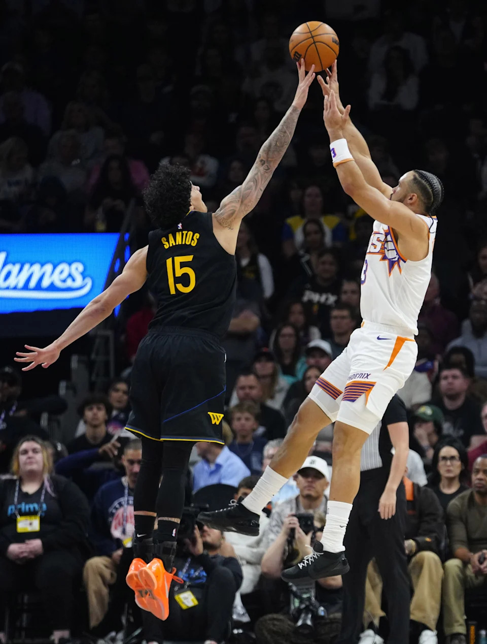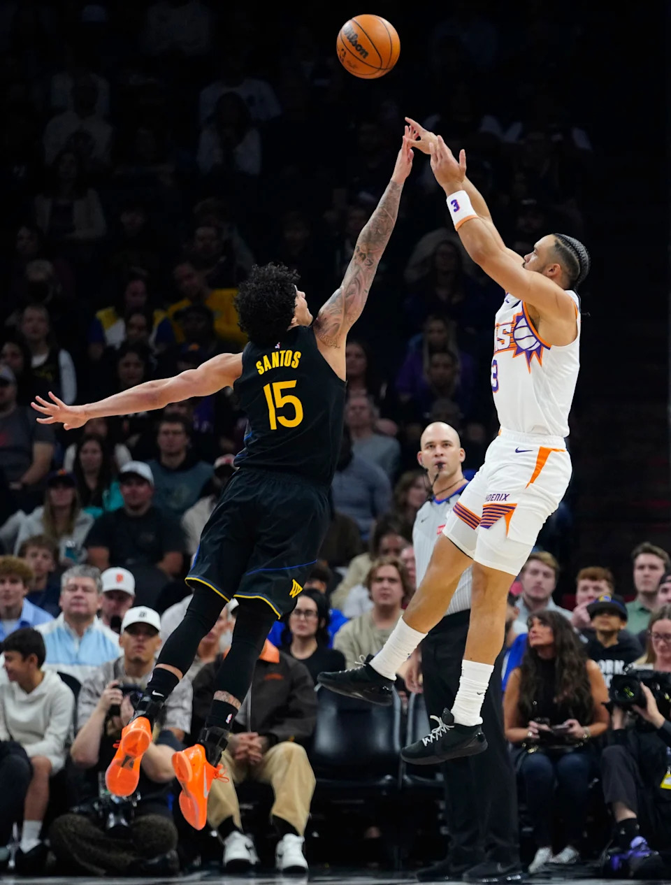 Warriors forward Gui Santos (15) blocks a shot from Suns guard Dillon Brooks (3) during a game at Mortgage Matchup Center in Phoenix on Feb. 5, 2026.