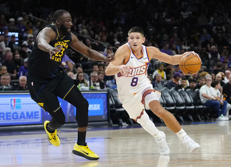 Suns guard Grayson Allen (8) drives to the lane against Warriors forward Draymond Green (23) during a game at Mortgage Matchup Center in Phoenix on Feb. 5, 2026.