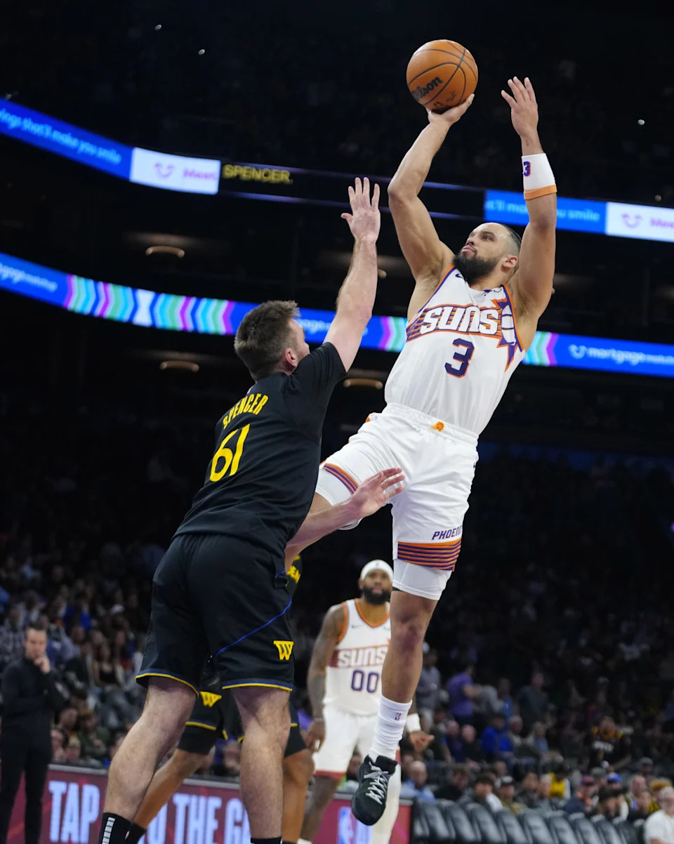 Suns guard Dillon Brooks (3) shoots a three pointer against Warriors guard Pat Spencer (61) during a game at Mortgage Matchup Center in Phoenix on Feb. 5, 2026.