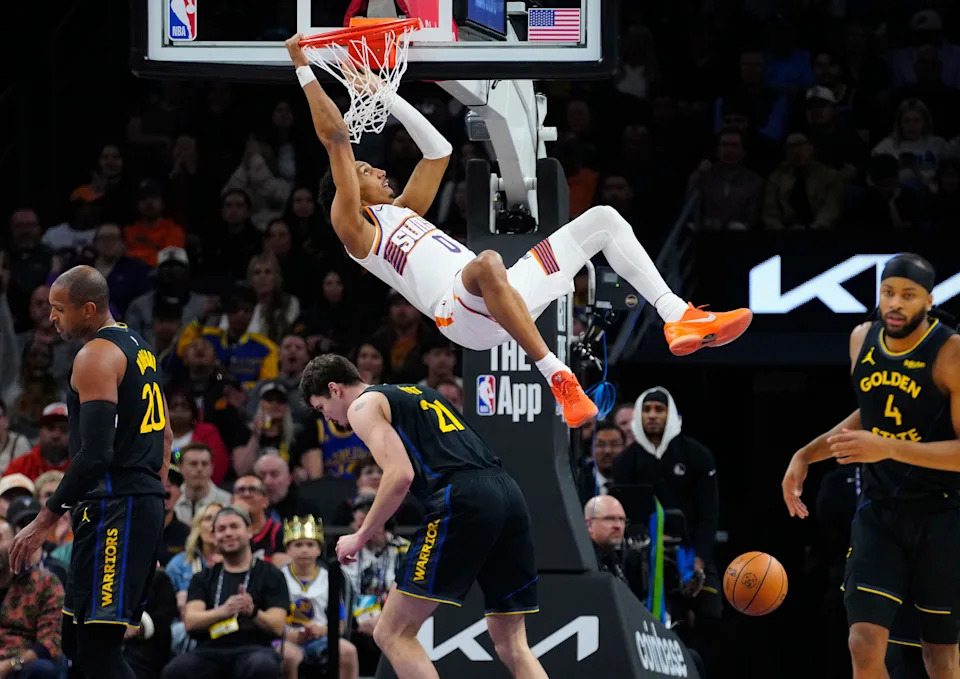 Suns center Oso Ighodaro (11) dunks against the Warriors during a game at Mortgage Matchup Center in Phoenix on Feb. 5, 2026.