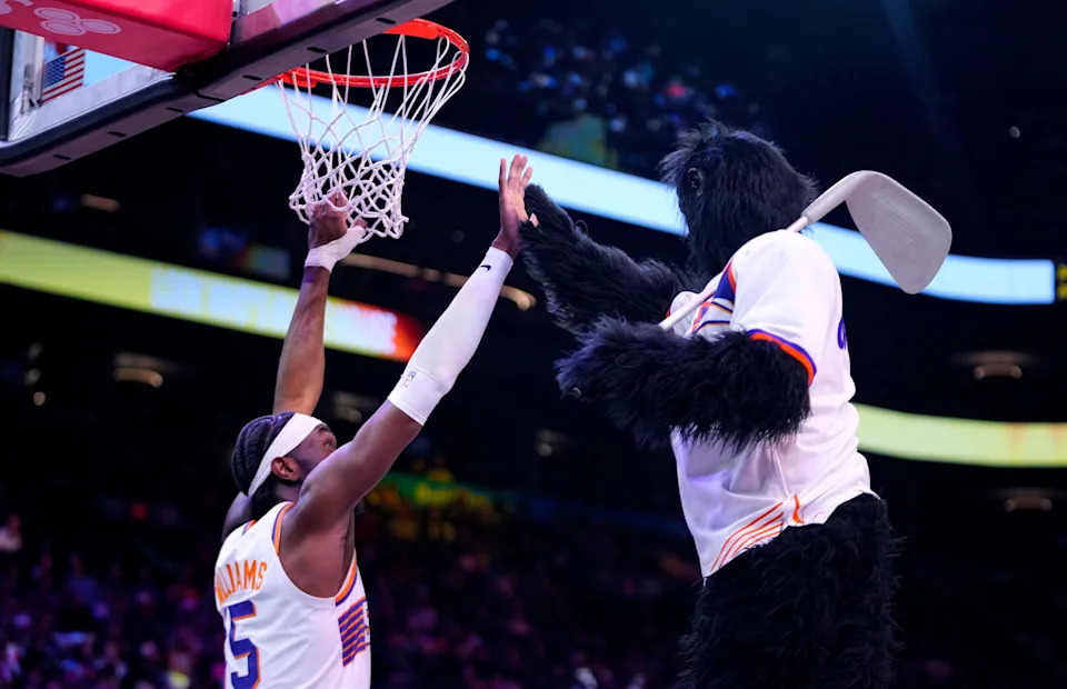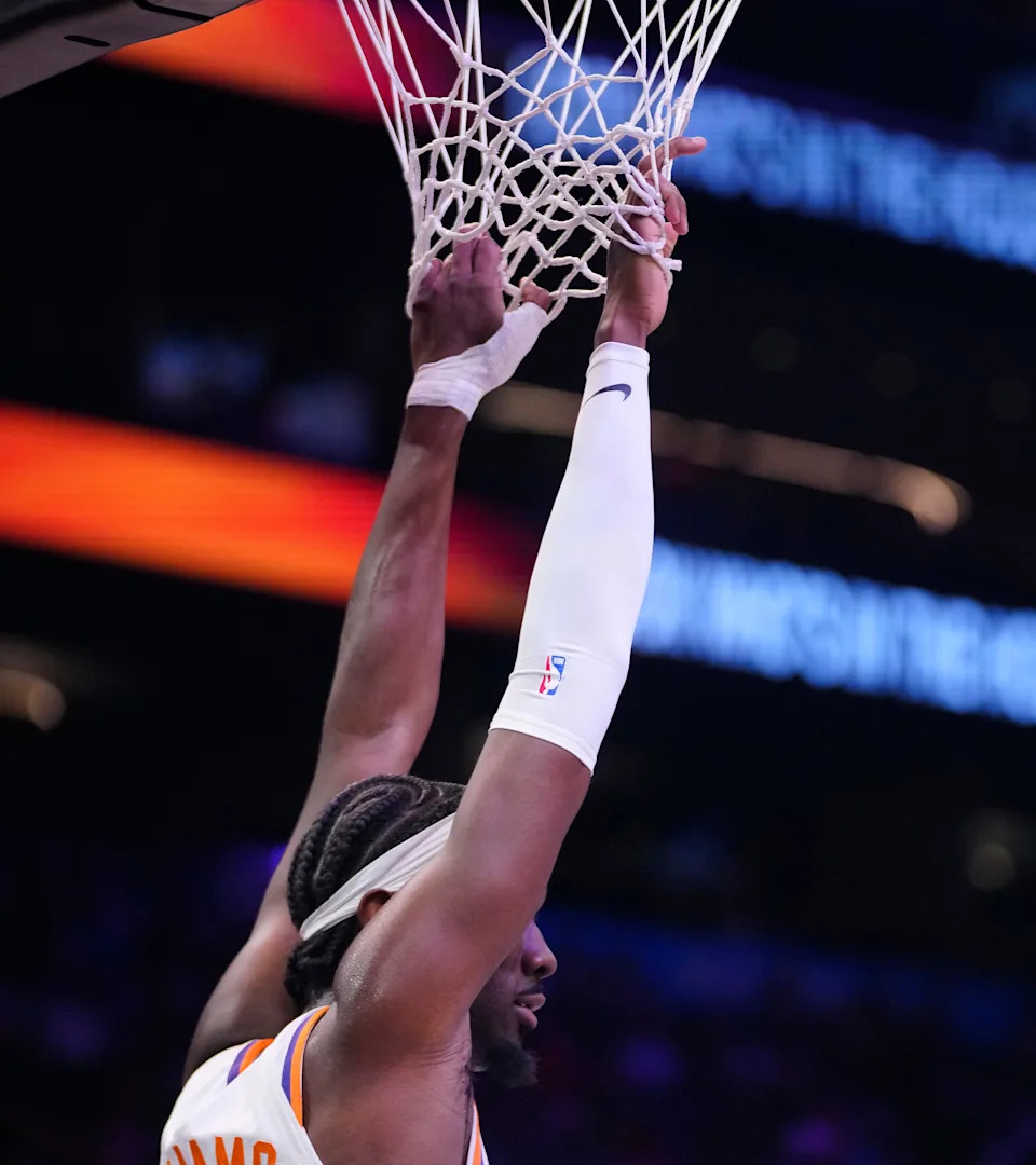 Suns center Mark Williams holds the net as he waits for the game to restart against the Warriors during a game at Mortgage Matchup Center in Phoenix, on Feb. 5, 2026.