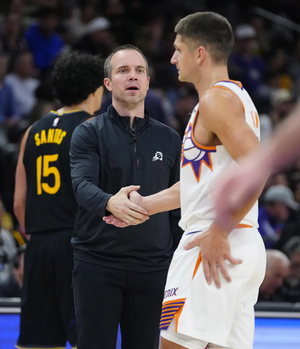 Suns head coach Jordan Ott talks with guard Grayson Allen (8) during a game against the Warriors at Mortgage Matchup Center in Phoenix on Feb. 5, 2026.