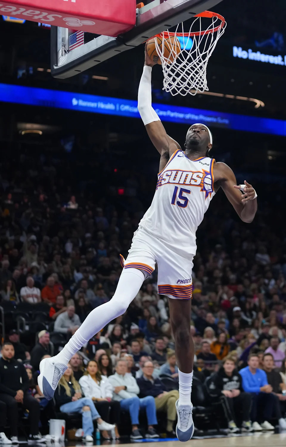 Suns center Mark Williams (15) dunks against the Warriors during a game at Mortgage Matchup Center in Phoenix on Feb. 5, 2026.