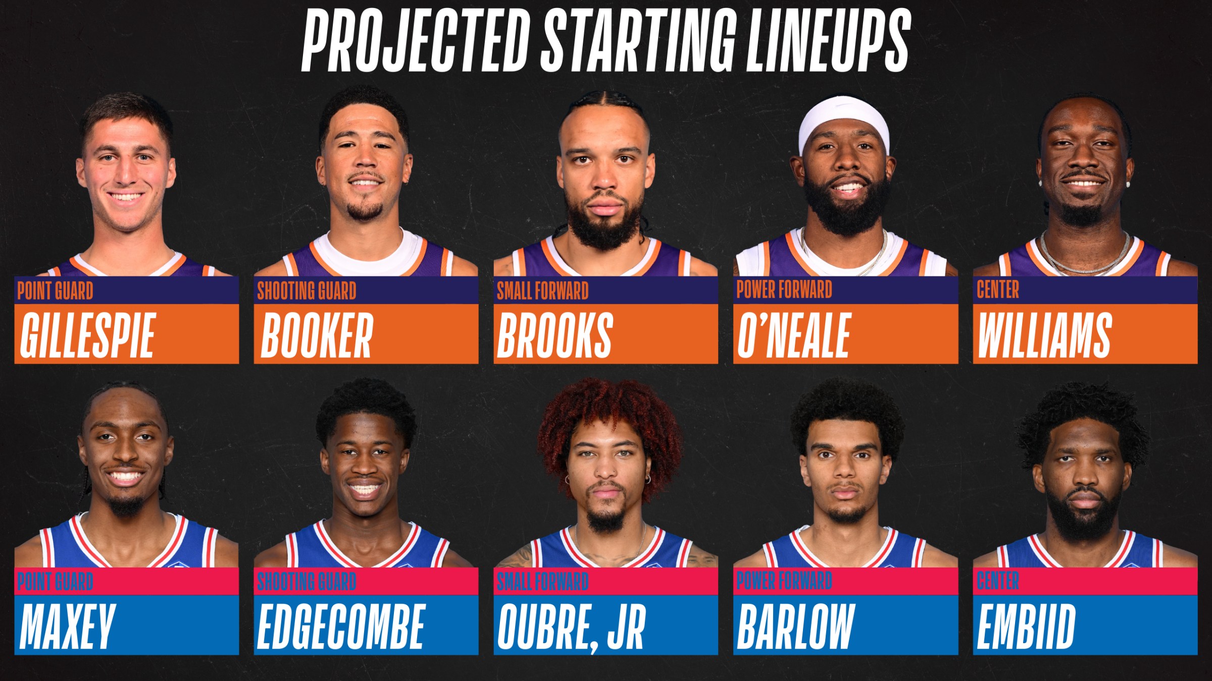 Devin Booker — QUESTIONABLE (Right Ankle Sprain)Jalen Green — QUESTIONABLE (Right Hamstring Management/Left Hip Contusion)Grayson Allen — OUT (Right Knee Sprain)Isaiah Livers — OUT (Left Shoulder Sprain)Joel Embiid — QUESTIONABLE (Right Knee Injury Management)Paul George — OUT (League Suspension)Kelly Oubre, Jr. — AVAILABLE (Left Knee)