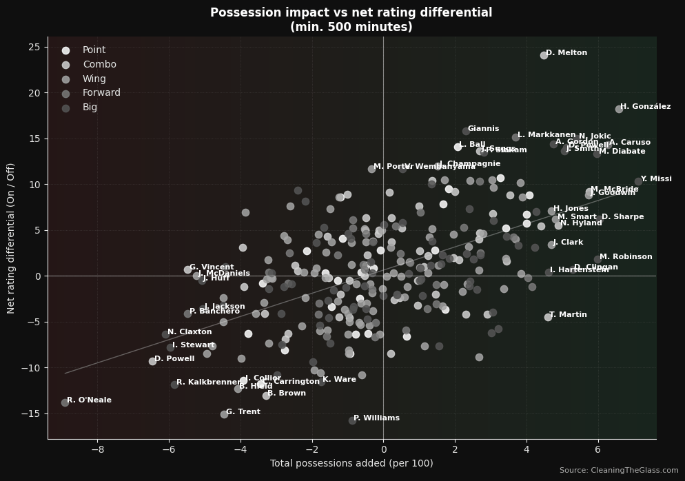 2024/25: correlation between Total Possessions Added and Net Rating (On/Off) = 0.4762025/26: correlation between Total Possessions Added and Net Rating (On/Off) = 0.558