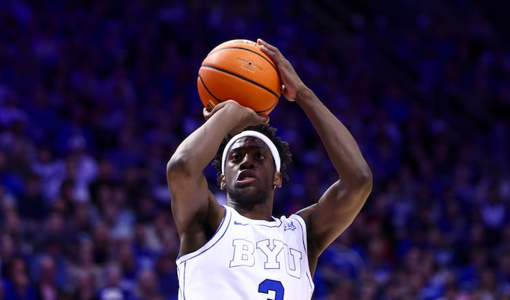 BYU forward AJ Dybantsa (3) shoots during the second half of an NCAA basketball game against the Houston Cougars at the Marriott Center in Provo on Saturday, Feb. 7, 2026. | Rio Giancarlo, Deseret News