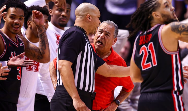 Houston Cougars head coach Kelvin Sampson argues with a referee during the second half of an NCAA basketball game against BYU at the Marriott Center in Provo on Saturday, Feb. 7, 2026. | Rio Giancarlo, Deseret News