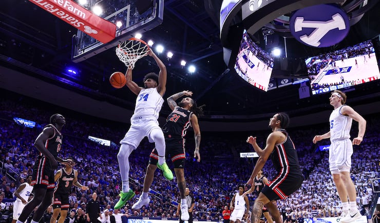 BYU forward AJ Dybantsa (3) dunks during the second half of an NCAA basketball game against the Houston Cougars at the Marriott Center in Provo on Saturday, Feb. 7, 2026. | Rio Giancarlo, Deseret News
