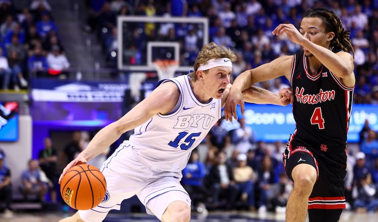 BYU guard Richie Saunders (15) drives to the basket against Houston Cougars guard Kingston Flemings (4) during the first half of an NCAA basketball game at the Marriott Center in Provo on Saturday, Feb. 7, 2026. | Rio Giancarlo, Deseret News