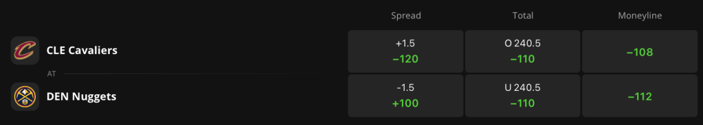 Looking at the odds for tonight, the Nuggets enter as narrow 1.5-point favorites and hold -112 odds on the Moneyline on DraftKings Sportsbook. The Cavaliers hold +108 odds of winning outright, with the game total set at 240.5 points.