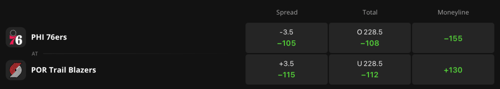Looking at the odds for tonight’s game, the 76ers are 3.5-point favorites and hold -155 odds on the Moneyline on DraftKings Sportsbook. The Trail Blazers are +130 underdogs with the game total set at 228.5 points.