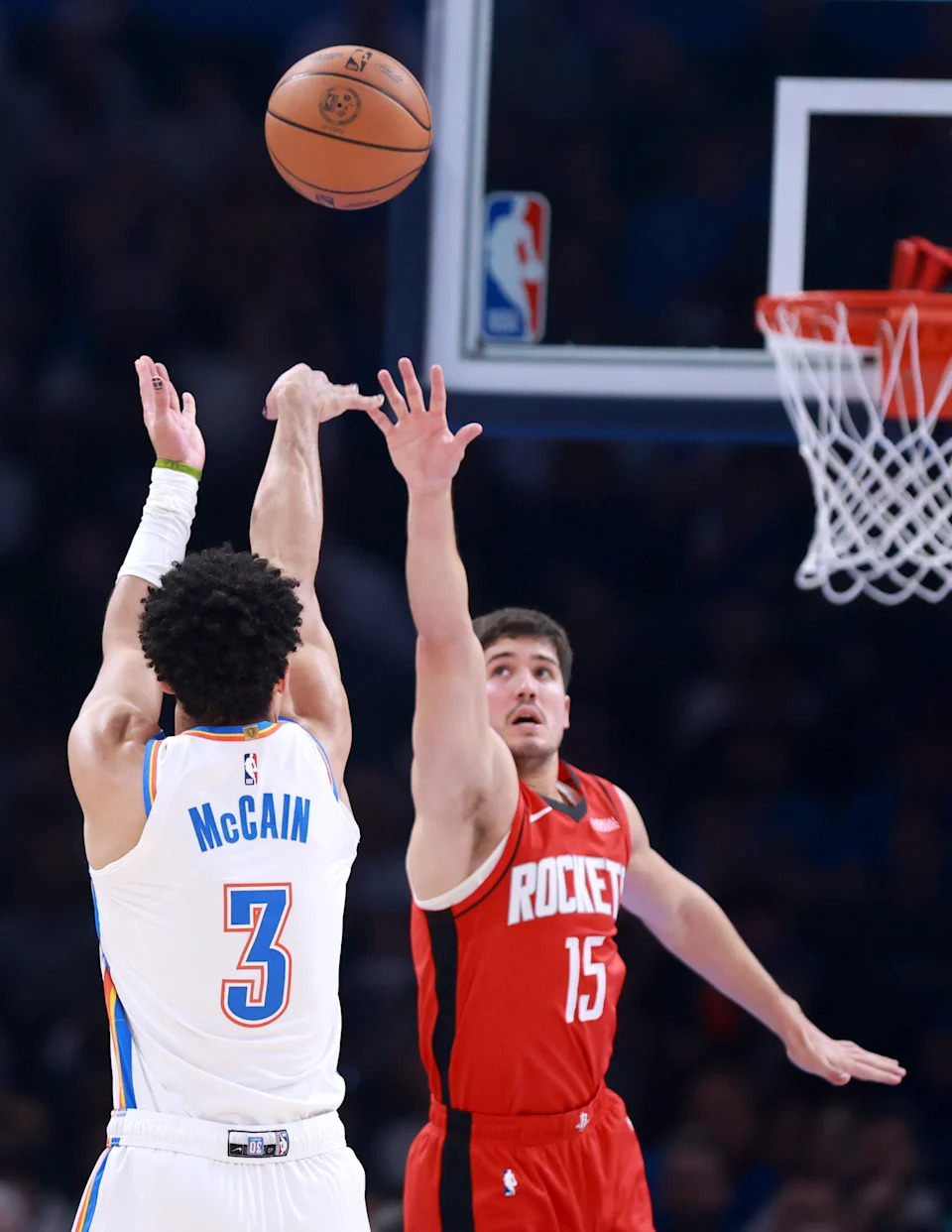 Oklahoma City’s Alex Caruso (9) shoots a 3-point basket as Houston’s Reed Sheppard (15) defends in second half of the NBA basketball game between the Oklahoma City Thunder and the Houston Rockets at Paycom Center in Oklahoma City, Saturday Feb. 7, 2026.