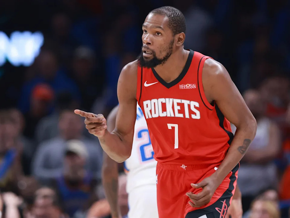Houston’s Kevin Durant (7) reacts aftin second half of the NBA basketball game between the Oklahoma City Thunder and the Houston Rockets at Paycom Center in Oklahoma City, Saturday Feb. 7, 2026.