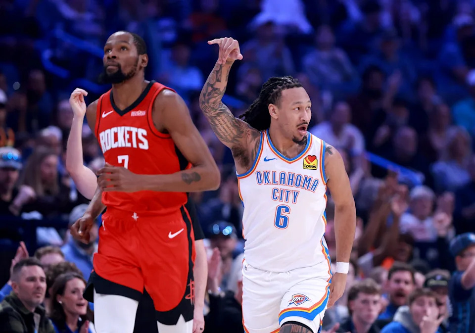 Oklahoma City’s Jaylin Williams (6) reacts after a 3-point next Houston’s Kevin Durant (7) in the first half of the NBA basketball game between the Oklahoma City Thunder and the Houston Rockets at Paycom Center in Oklahoma City, Saturday Feb. 7, 2026.