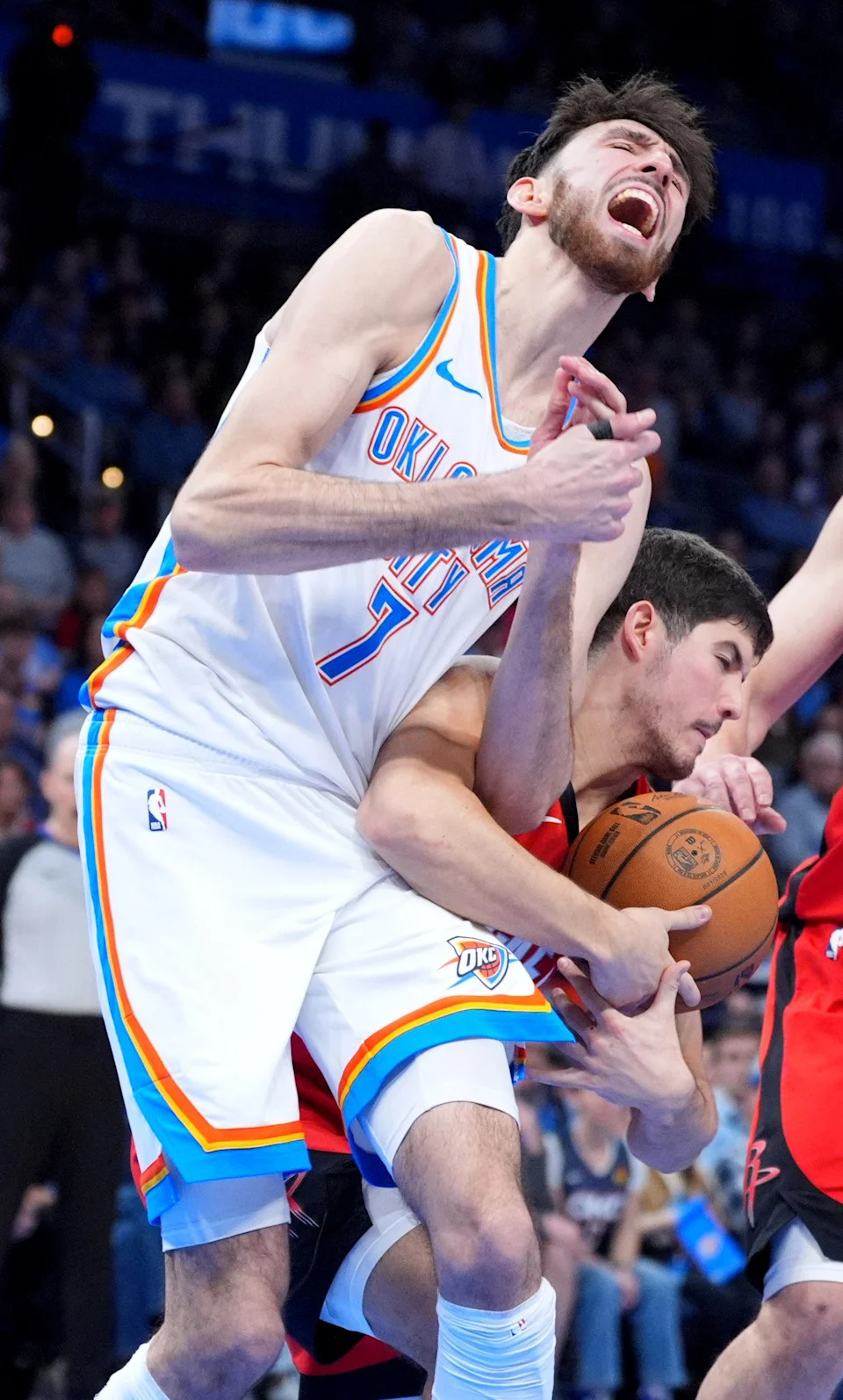 Oklahoma City’s Chet Holmgren (7) is fouled by Houston’s Reed Sheppard (15) in second half of the NBA basketball game between the Oklahoma City Thunder and the Houston Rockets at Paycom Center in Oklahoma City, Saturday Feb. 7, 2026.