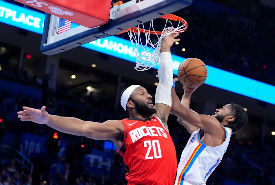 Oklahoma City’s Isaiah Joe (11) goes to the basket as Houston’s Josh Okogie (20) defends in second half of the NBA basketball game between the Oklahoma City Thunder and the Houston Rockets at Paycom Center in Oklahoma City, Saturday Feb. 7, 2026.