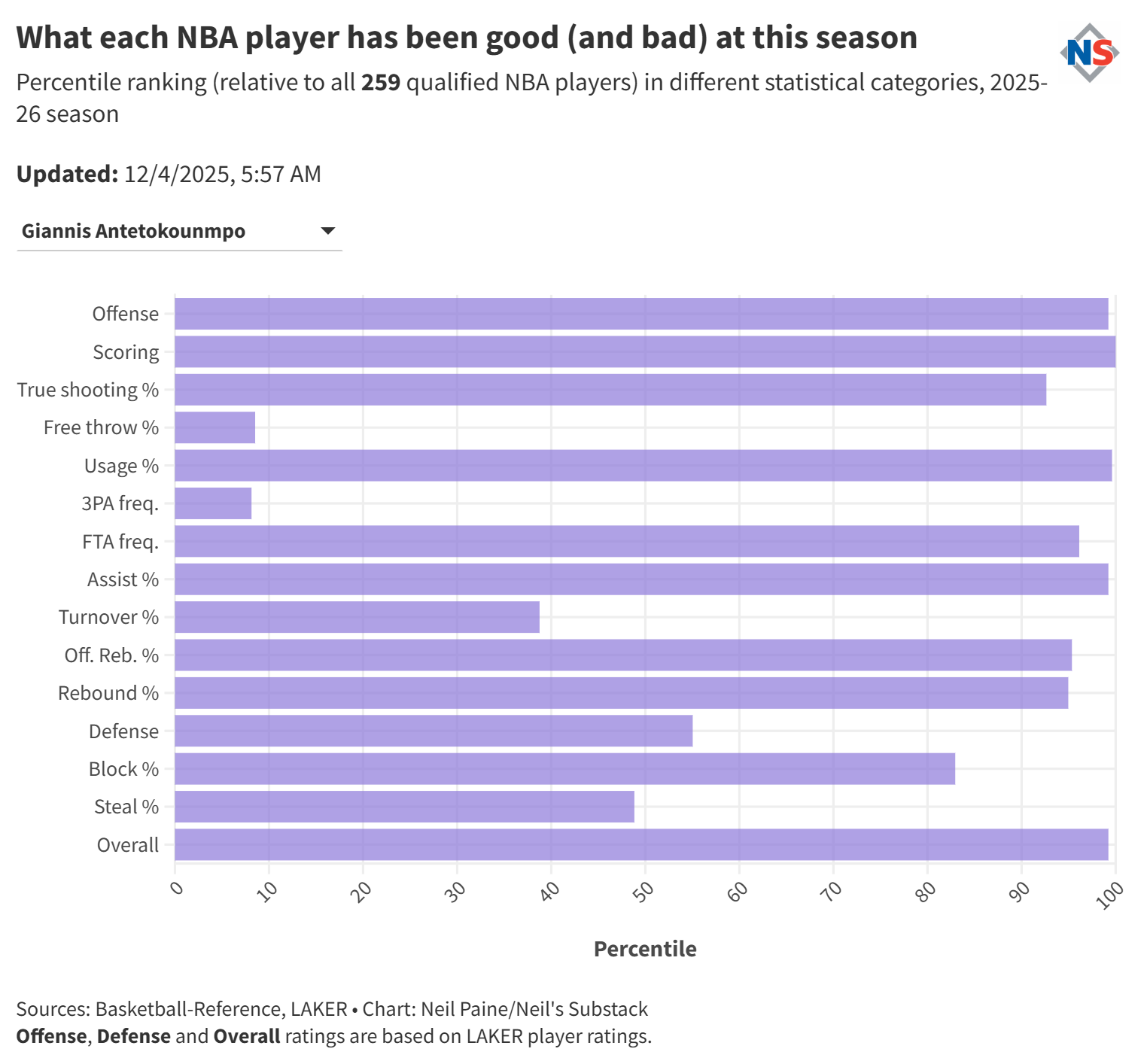 We don’t know what the future holds for Antetokounmpo in any sense right now, but all of this matters because he is still so good. Despite the missed games, he ranks seventh in the league in my LAKER Wins Above Replacement metric, with an estimated effect of +9.4 points per 100 possessions to the Bucks’ net rating while he’s on the court. Among qualified NBA players this season, he ranks among the 93rd percentile or better in scoring volume and efficiency, foul-drawing, assists, rebounding (offensive and total), offensive impact, and overall impact.