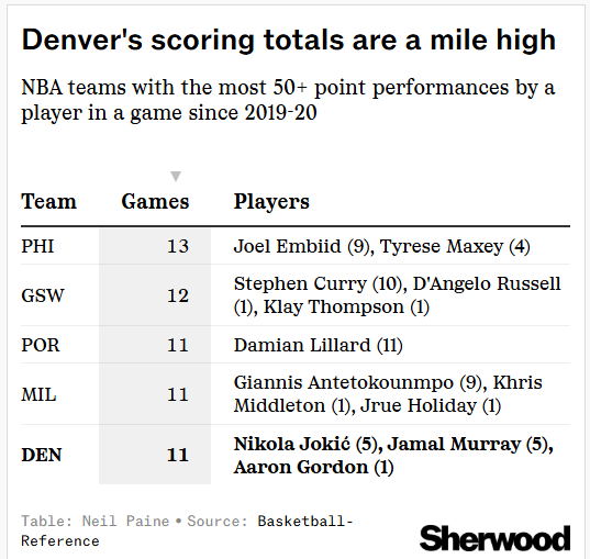Facing the Indiana Pacers on Wednesday night, Denver Nuggets guard Jamal Murray didn’t miss — well, practically not. He went 19-for-25 from the field and 10-for-11 from downtown — tying the NBA record for 3-point shooting accuracy in any game with double-digit makes from deep — en route to an eye-popping 52 points. Somehow, that wasn’t a career-best night for Murray, though: he scored 55 back in February, and he has five career 50+ point games including the playoffs. Since 2020, it was the 11th 50-point game for a Denver player; only the Sixers and Warriors have featured more 50-burgers over that span: