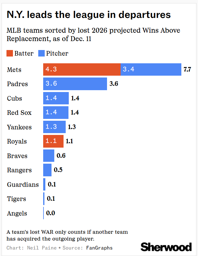 In theory, baseball’s hot stove season is when having the sport’s deepest-pocketed owner is the biggest advantage, as a team could theoretically outspend its rivals for the best free agents and other available talent. However, the Mets and owner Steve Cohen have been disproving that theory so far this offseason, with two of the biggest deals of free agency — first baseman Pete Alonso going to the Orioles and relief pitcher Edwin Diaz joining the Dodgers — actually seeing players depart Queens. Cohen is preaching patience with the team’s offseason plans, but for now, no team has lost more talent to other teams, according to FanGraphs’ 2026 roster projections: