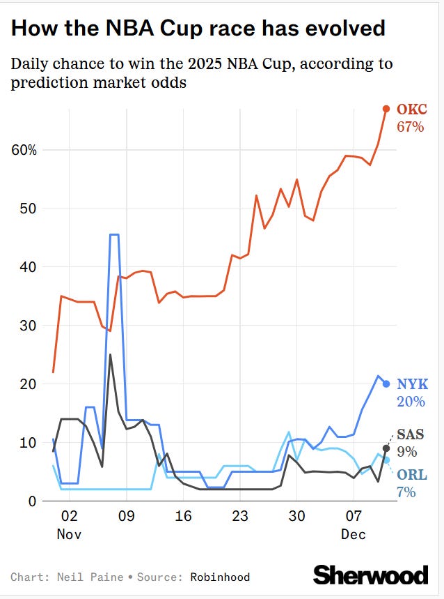Obviously, the biggest thing that stands out is Oklahoma City’s very lopsided status as the favorite, with a whopping 67% chance to win the title. The defending NBA champion Thunder are in the midst of a historic season overall, winning 24 of their first 25 games to start the year — joining the 2015-16 Golden State Warriors, who went on to break the league’s single-season wins record, as the only teams to ever do that — and their 49-point victory margin over the Suns Wednesday was the widest ever in an NBA Cup knockout game. (It was their 16th win in a row, as well.) The prediction market for OKC winning at least 70 games is now trading with a probability of 70%, which is incredible when we consider that feat has happened only twice before in the sport’s nearly 80-year history.